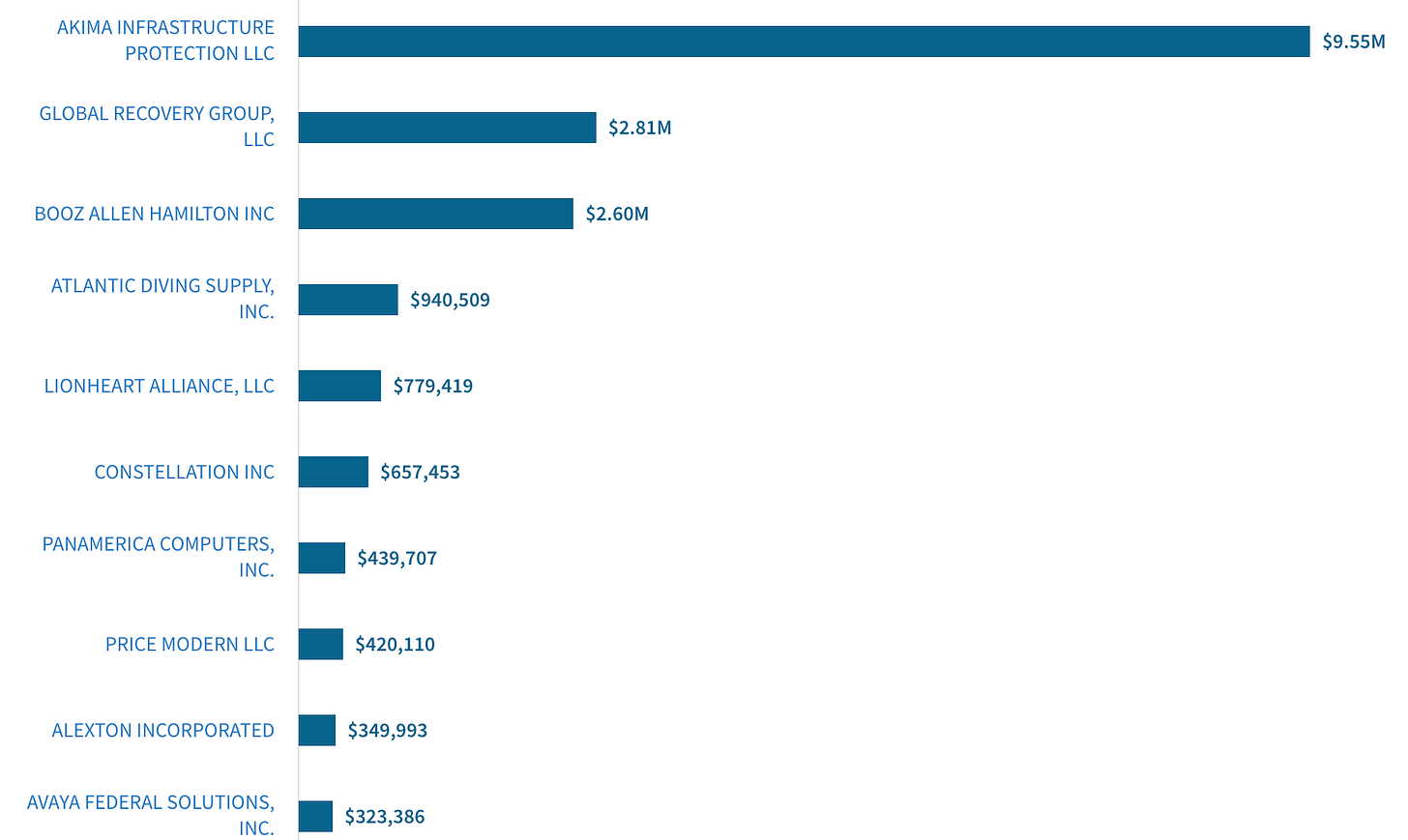 Akima Infrastructure Protection (headquartered in Herndon, VA) - $9.6M for detention and transportation services at the Port Isabel Detention Center