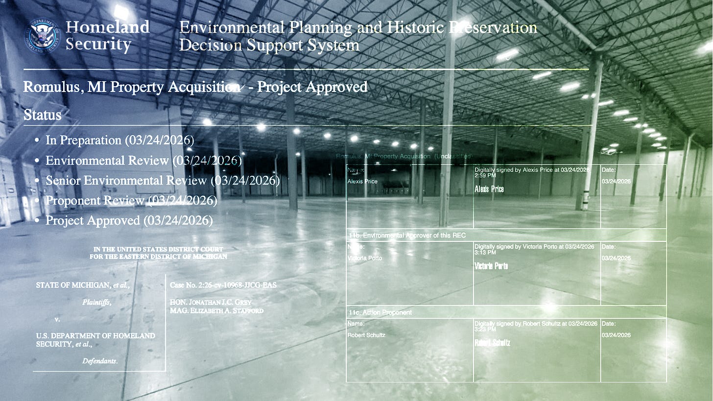 Federal officials defended a plan to convert a suburban Detroit warehouse into an immigration detention facility in a late-night court filing, as records show the project’s environmental review was completed in a single day — just hours after Michigan filed suit.