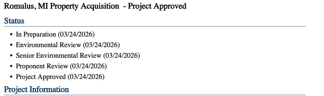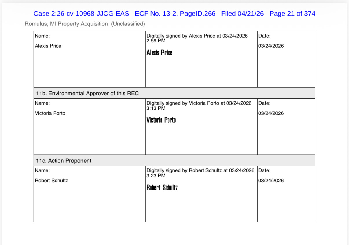 A Record of Environmental Consideration, or REC, completed on March 24 — more than a month after the property was purchased and the same day Michigan filed its lawsuit — determined that the project qualified for a categorical exclusion, a streamlined form of review used for actions that “normally do not significantly affect the quality of the human environment.”