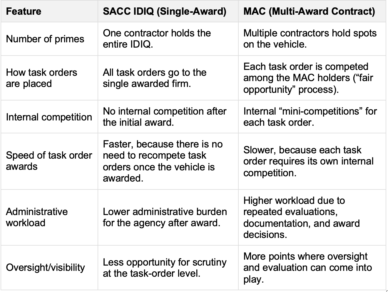 The proposed SACC model might skip even that limited competition and transparency. ICE could pre‑award contracts to a select group of firms and issue task orders directly on an as-needed basis.
