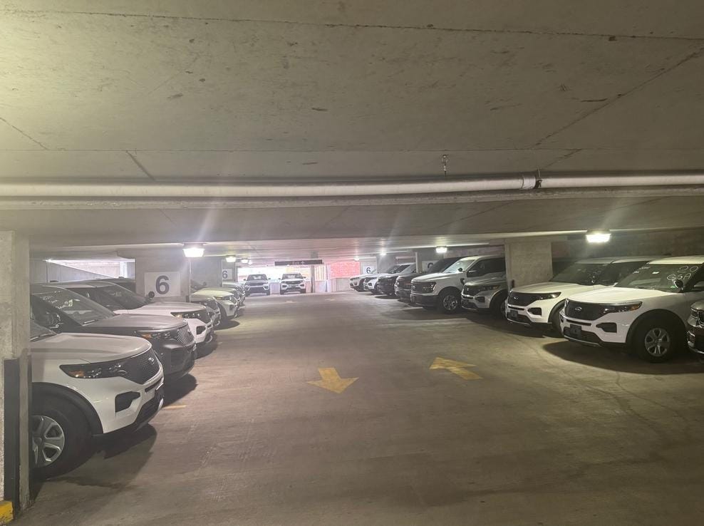 Beginning around 3:00 P.M. and continuing at least until 8:30 P.M., eyewitnesses reported to Project Salt Box the movement of roughly 56 unmarked vehicles — some bearing ICE parking placards, most without license plates — from the upper floors of the Symphony Center garage at 1030 Park Ave. The garage is part of a trio of buildings owned by the Maryland Transit Authority (MTA) and leased to David S. Brown Enterprises, an Owings Mills-based company. It is operated by Federal Parking Incorporated (F.P.I.).