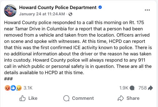 This comes days after a social media dispute in which HoCo Councilwoman Liz Walsh posted a warning about potential ICE activity in the Oakland Mills neighborhood. HCPD responded publicly on Facebook, clarifying it was a covert operation related to an “online child solicitation investigation.” The post was even picked up by LibsofTiktok, an account infamous for inciting mass doxxing campaigns of queer faculty.