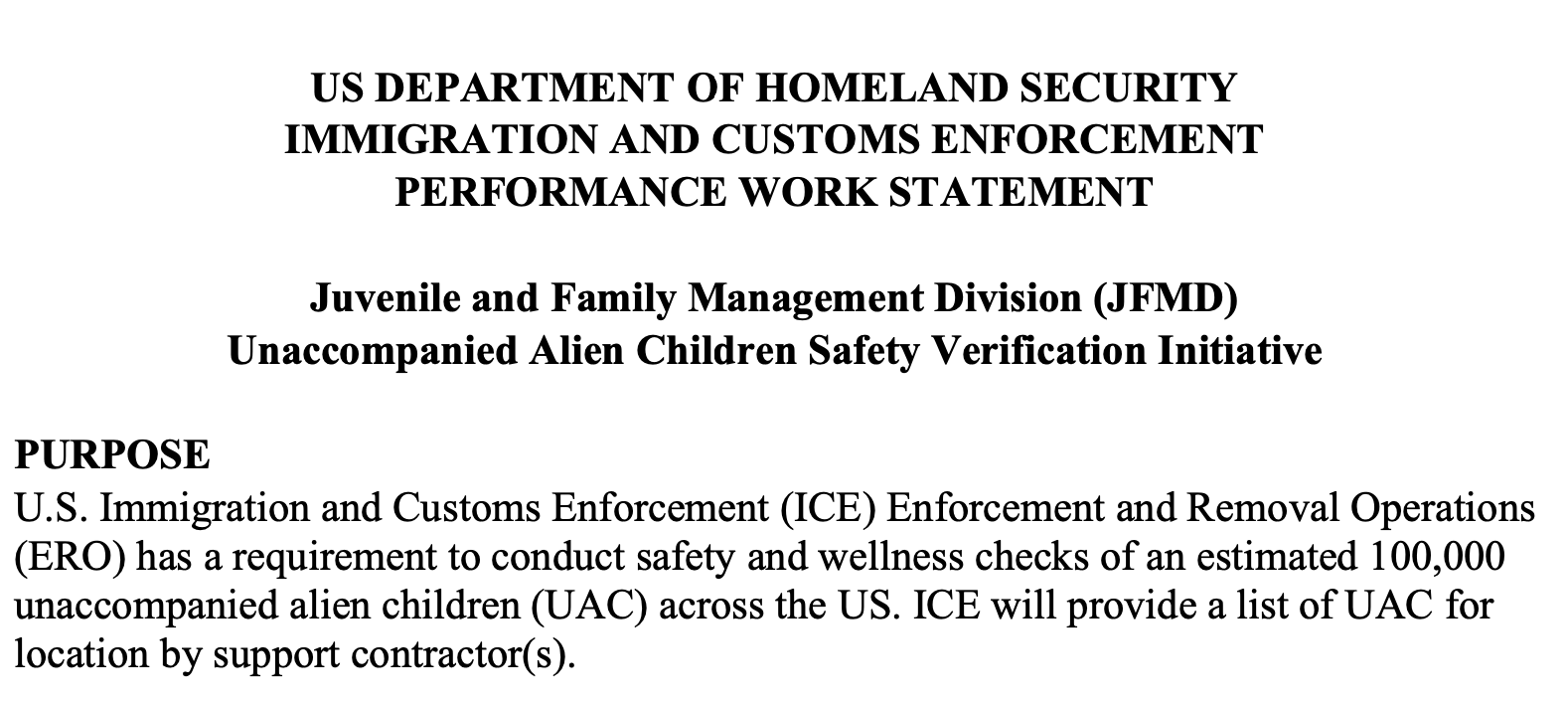 Yesterday afternoon, ICE ERO released a request for proposals (RFP) on SAM.gov requesting contractor support to “conduct safety and wellness checks of an estimated 100,000 unaccompanied alien children (UAC) across the US.” Labeled as the “Safety Verification Initiative,” this RFP is the latest development in a year’s long campaign by ICE to track down UAC who were encountered by DHS and subsequently released from the care and custody of the Department of Health and Human Services, Office of Refugee Resettlement.