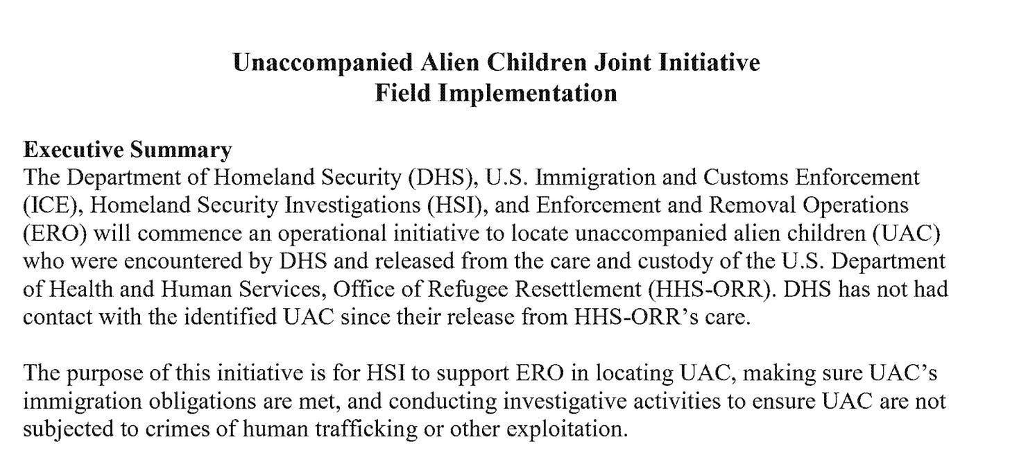 In January 2025, ICE issued a memo titled, “Unaccompanied Alien Children Joint Initiative Field Implementation.” The stated purpose of the initiative was to establish a working relationship between Homeland Security Investigations (HSI) and Enforcement Removal Operations (ERO) to locate UAC, make sure their immigration obligations are being met, and to ensure children are not subjected to crimes of human trafficking or other exploitation.