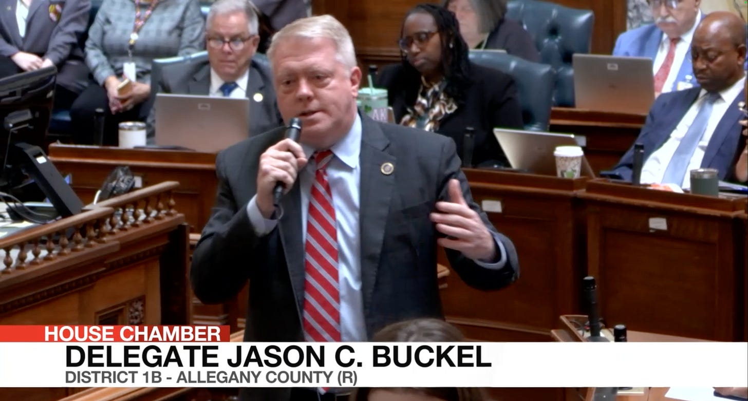 Del. Jason Buckel, a Republican from Allegany County, opposed HB 1017 on the grounds that a Maryland detention facility would benefit detainees by keeping them close to their families and lawyers. “We’ll construct a facility — a modern facility, a large facility — that’s not overcrowded, in Maryland, an hour or two away from individuals who may be swept up in immigration enforcement in Maryland,” Mr. Buckel said. “And what is the response of our General Assembly? ‘No.’”