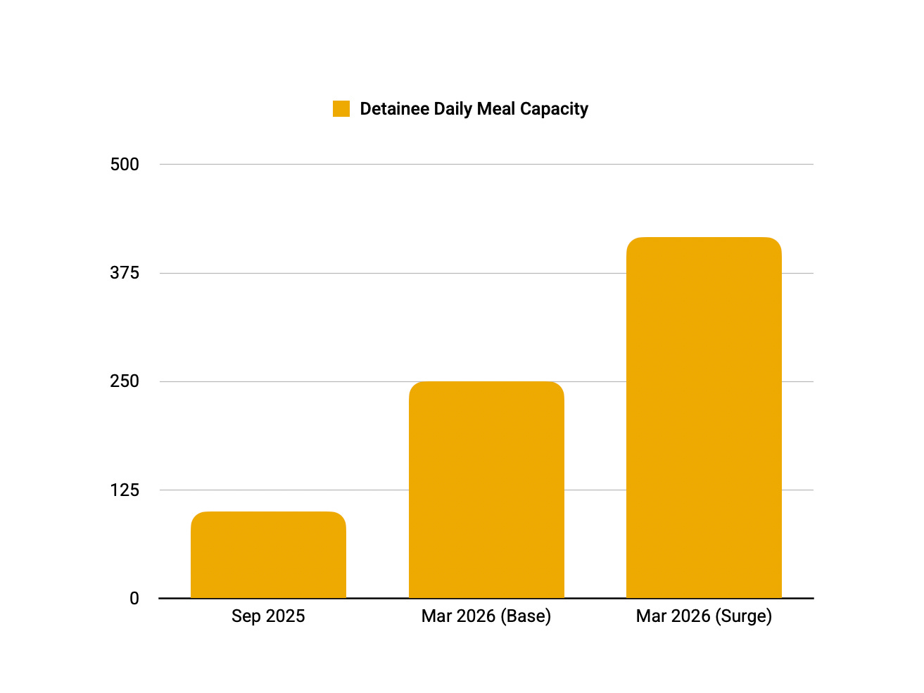 In September 2025, ICE awarded a contract specifically for "Baltimore AOR detainees" — meaning all detainees within the agency's Baltimore area of responsibility — supplying 18,000 shelf-stable meals every 90 days, enough to feed roughly 100 people per day. The solicitation posted this month seeks 45,000 meals for the same period, a 150 percent increase in base volume. Surge provisions allow the agency to request up to 10,000 additional meals per month on 30 days' notice, pushing maximum daily capacity to approximately 416 detainees — a 316 percent increase over the prior contract's ceiling. The previous contract ran for six months. The new one runs for up to five years.