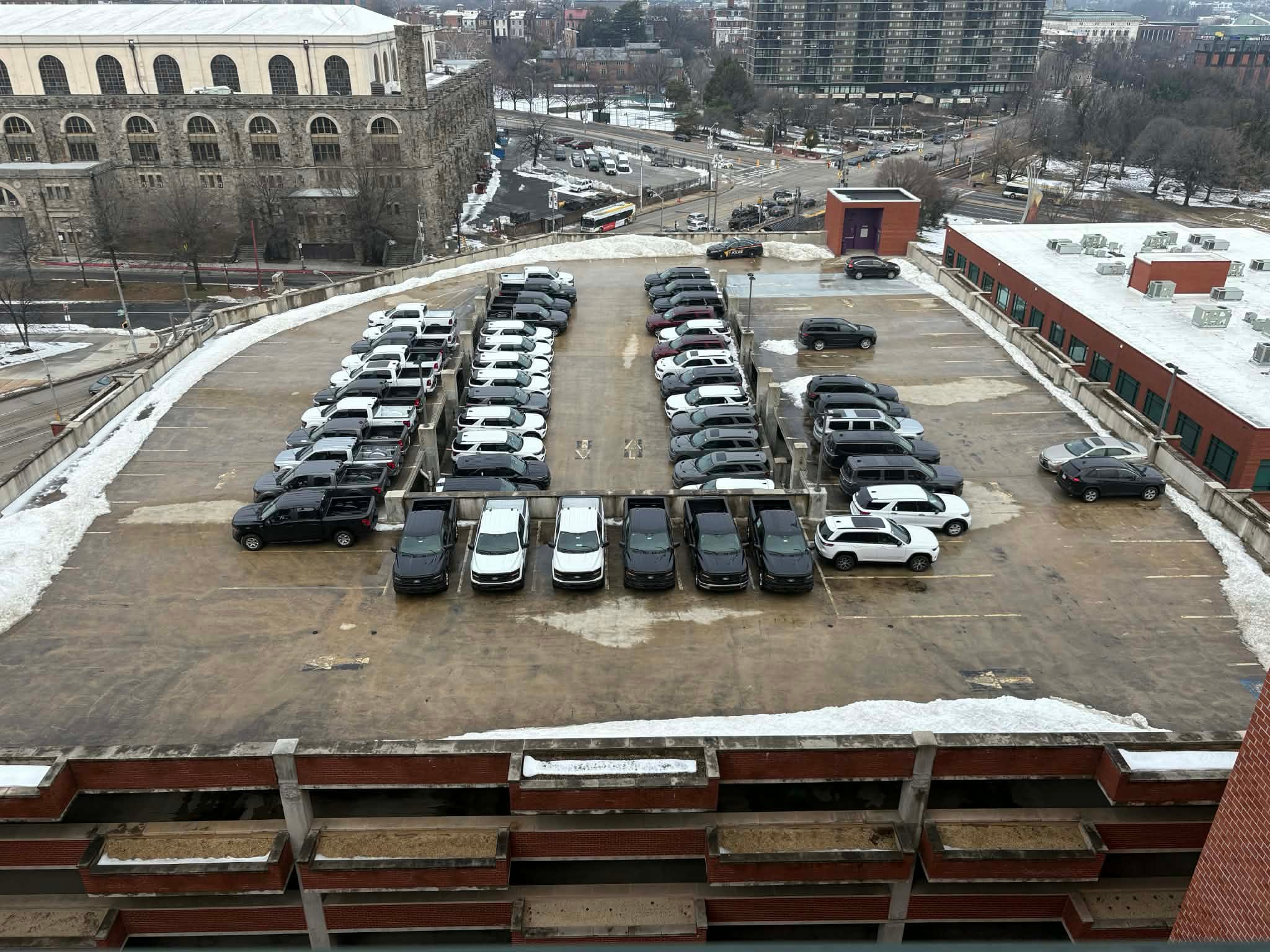 The meal contract is just one piece of a broader regional buildup. In recent weeks, dozens of new law enforcement vehicles have appeared at sites around Baltimore — among them a fleet of approximately 50 staged in the Symphony Center garage at 1030 Park Avenue in the city’s Midtown-Belvedere neighborhood, several bearing ICE placards.